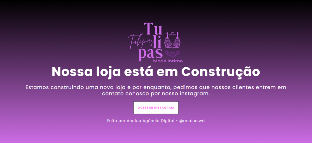 Tulipas – Moda Íntima Nome do Cliente: Tulipas – Moda Íntima – Loja Virtual/ E-commerce Descrição do Cliente: Ana Cristina estava em busca de uma loja virutal, que possa mostrar seus produtos e atrair potenciais clientes. Ela desejava que seu site transmitisse seu estilo distintivo e seja uma vitrine elegante de seus produtos. Criação de Loja Virtual Criação de Conteúdo API Whatsapp Manutenção e Atualização de conteúdo Registro nos Serviços Google ver projeto solicitar um orçamento